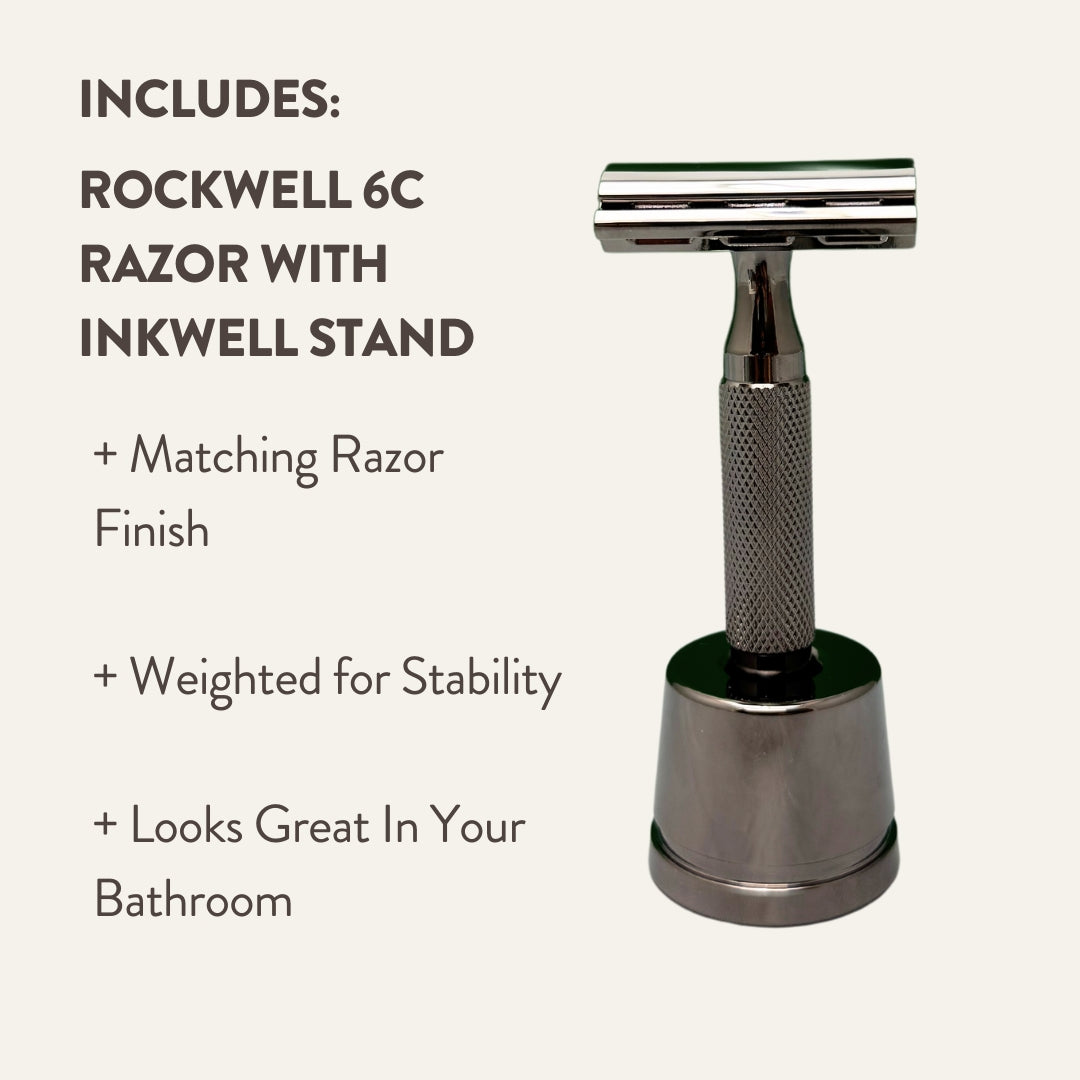 - 1 Matching Inkwell Stand: Elegant inkwell stand in chrome finish to display your 6C Razor.