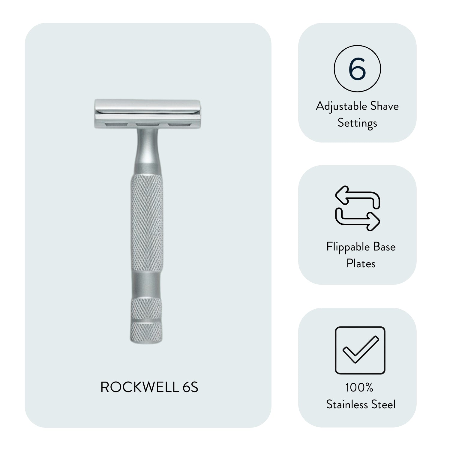 Crafted from premium 316L stainless steel, this razor is built to last a lifetime while delivering a smooth, irritation-free shave every time. With 6 adjustable shave settings using our patented base plate technology, the Rockwell 6S allows you to adjust the blade gap and fine-tune the comfort and closeness of your shave, for a truly personalized experience.
